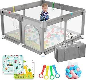 JUPPLIES Parque Infantil Bebe 120x120cm + Alfombra Bebe + 50 Bolas + Agarraderas + Bolsas de Transporte – Corralito Bebe con Malla Transpirable – Parque de Juegos Bebe – Playpen Bebe – (Gris)