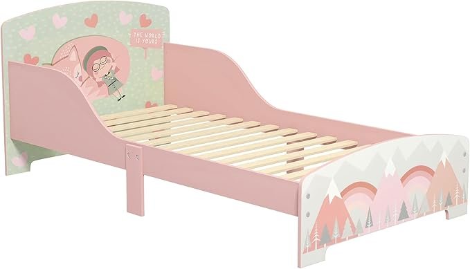 ZONEKIZ Cama Infantil de Madera 143x77x60 cm Cama para Niños de 3-6 Años con Barreras de Protección y Estampados Carga Máx. 40 kg Mueble de Dormitorio Moderno Rosa