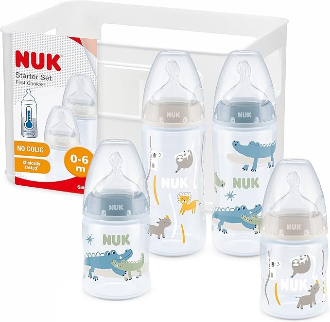NUK First Choice+ set de 4 biberones anticólicos de iniciación y 1 cesta | 0-6 meses | Tetina de silicona con forma anatómica | Sin BPA | Cocodrilo (azul) | 5 unidades
